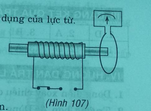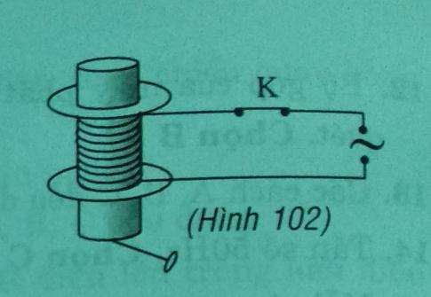 Câu 20: Trên hình vẽ 107 bố trí một thí nghiệm, biết rằng trong khung dây kín có dòng điện cảm ứng. Thông tin nào sau đây là sai khi nói về dòng điện chạy trong nam châm điện?