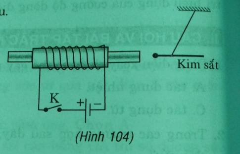 Câu 12: Trong thí nghiệm ở hình 104, lúc đầu dùng dòng điện một chiều kim sắt bị hút về phía nam châm điện. Hiện tượng xảy ra đối với kim sắt như thế nào nếu ta thay dòng điện một chiều bằng dòng điện xoay chiều chạy vào nam châm điện?