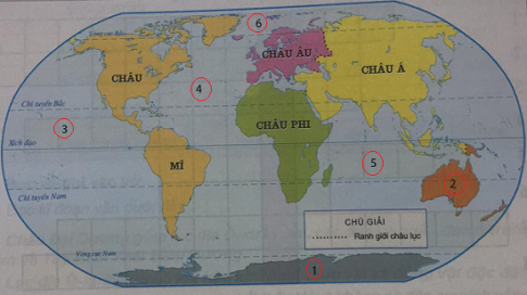 a. Nhóm trưởng đến góc học tập lấy lược đồ trống như hình dưới đây và các thẻ chữ: Thái Bình Dương, Bắc Băng Dương, Ân Độ Dương, Đại Tây Dương, châu Đại Dương, châu Nam Cực.