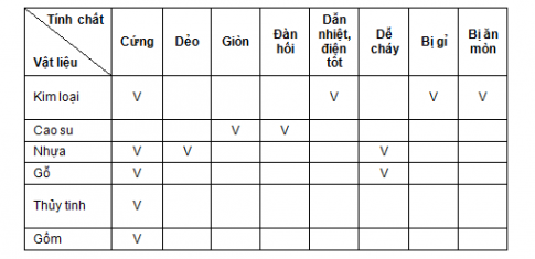 Từ quan sát thực tế, em hãy cho biết một số tính chất của các vật liệu: kim loại, cao su, nhựa, gỗ, thuỷ tinh và gốm. Tích dấu V để hoàn thành theo mẫu bảng 11.2