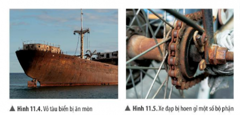 - Quan sát hình 11.3,11.4 và 11.5, em hãy cho biết những vật liệu nào dễ bị ăn mòn, bị hoen gỉ dẫn đến hư hỏng công trình, vật dụng. Nêu nguyên nhân dẫn đến sự hư hỏng đó.