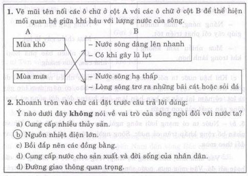 Vẽ mũi tên nối các ô chữ ở cột A với các ô chữ ở cột B để thể hiện mối quan hệ giữa khí hậu với lực lượng của sông
