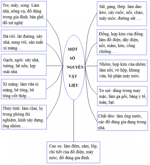 6. Viết công dụng chính của các nguyên vật liệu vào chỗ chấm (...) trong sơ đồ sau cho phù hợp (trang 59 sgk)