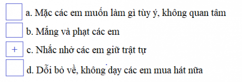 Câu 3: Em cùng các bạn tổ chức sinh hoạt Sao Nhi đồng cho các em lớp một. Khi đang dạy các em múa hát thì có hai em đùa nghịch, mất trật tự. Em sẽ chọn cách giải quyết nào trong các cách giải quyết dưới đây? Đánh dấu + vào ô trống trước cách giải quyết em chọn.